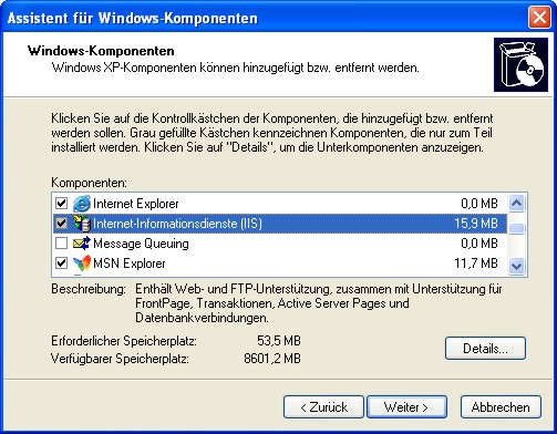 Internet-Informationsdienste ist der Windows Dienst, der dass Veröffentlichen von Informationen im Intranet vereinfacht. Unter Windows wird Internet-Informationsdienste nicht standardmäßig installiert. Mithilfe der Anwendung Software in der Systemsteuerung können Sie IIS installieren. Sie benötigen hierzu Ihre Windows CD. Weitere Informationen zu diesem Thema finden Sie unter FAQ und der Windows Hilfe.