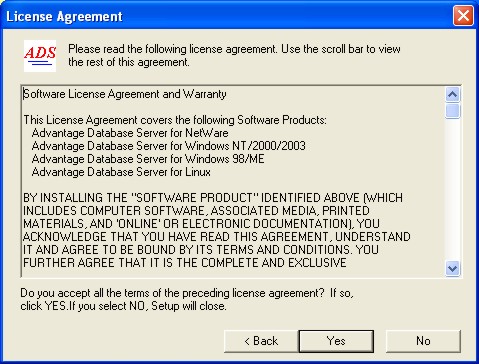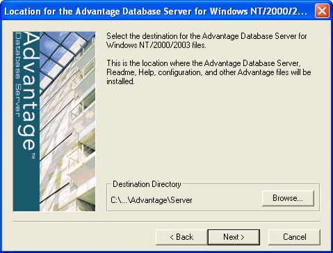Danach können Sie ein Zielverzeichnis auswählen. Standard ist hier C:\Programme\Extended Systems\Advantage\Server. Klicken Sie auf Browse wenn Sie das Verzeichnis ändern möchten. Die Abfrage ob das Verzeichnis erstellt werden soll, bestätigen Sie mit einem Klick auf Yes. In das gewählte Verzeichnis werden alle benötigten Dateien kopiert.