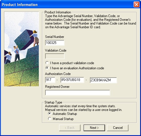 Jetzt müssen Sie die Seriennummer und den Validation Code eingeben. Haben Sie eine Testversion, so wählen Sie hier „I have an evaluation Authorization code“ aus und geben den erhaltenen Authentifizierungs-Code ein. Bei neueren Demoversionen (ab 2005) ist die Installation der Datenbank nicht mehr notwendig.