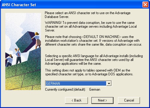 Die Datenbank arbeitet mit einem definierten Zeichensatz, der während der Installation ausgewählt werden muss. Es gibt die Möglichkeit einen Zeichensatz für ANSI und für OEM Zeichen auszuwählen. Bitte lassen Sie keinen dieser Werte auf Default stehen, sondern wählen Sie einen Zeichensatz, z.B. German für Deutschland. Klicken Sie auf Next und wählen Sie auch im nächsten Fenster den Zeichensatz German in der Dropdown Box.
