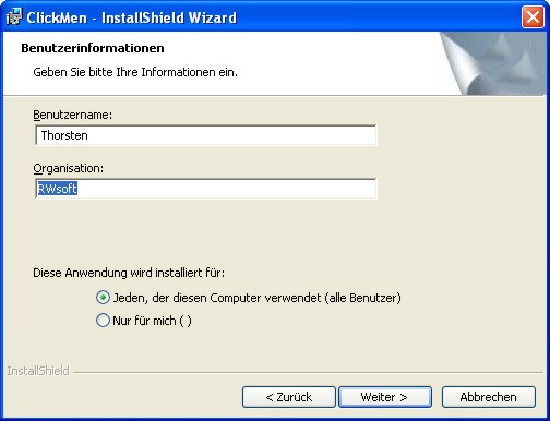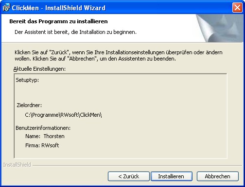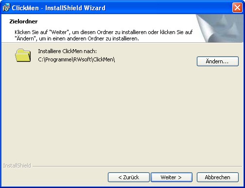 Danach können Sie ein Zielverzeichnis auswählen. Standard ist hier C:\Programme\RWsoft\ClickMen. Klicken Sie auf Ändern wenn Sie das Verzeichnis ändern möchten. In das gewählte Verzeichnis werden alle benötigten Dateien kopiert.